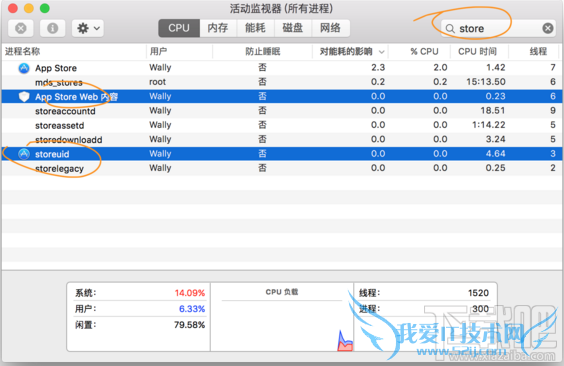 2、找到右上角那个搜索条, 输入 store 会找到两个进程, 把Storeuid 与 App Store web 内容点击左上角那个叉子图标强制退出