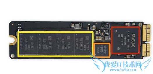 两边黄色框内是八颗三星 K9LDGY8S1D-XCK0 NAND 闪存颗粒,单颗 16GB,总计 128GB。