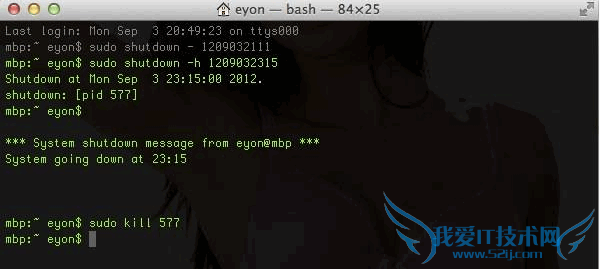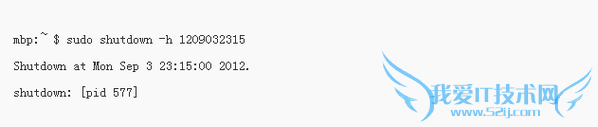 有些果迷可能还有问题:如果我想临时取消定时关机/睡眠/重启怎么办呢?其实也很简单,还是通过实例来说明。比如,我们在终端中执行了2012年9月3日23:15分关机的命令,终端中会显示如下: