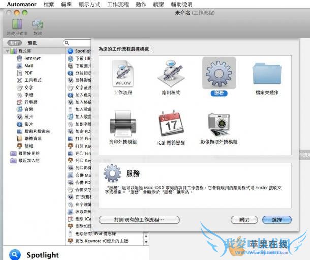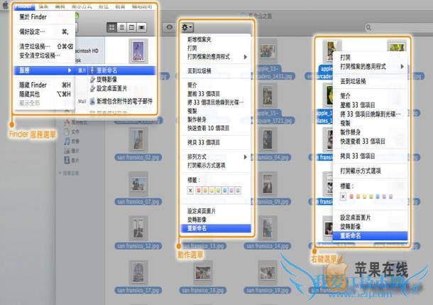透过 Mac OS X 中的“服务”选单,您在执行某个应用程序时,也可以使用另一个应用程序的功能。Snow Leopard 中的服务更加简便实用。它只显示和当前使用程序或浏览内容相关的服务项目,而不是所有服务项目。只要按鼠标右键或按住 Control 并按下触控板按钮即可使用服务功能。您可以自行设定选单,让它只显示您想要的服务选项,或使用 Automator 建立您自己的服务。以下就教您如何灵活运用Automator来製作方便好用的』服务』选单。此篇示范的为重新命名大量的图片文件名称。