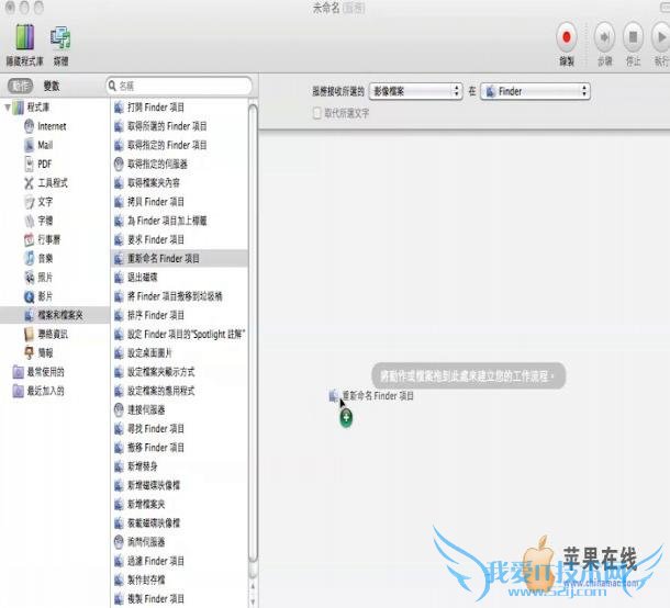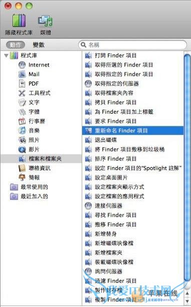 4.从左侧边的程序库类型栏位选择「文件和文件夹」选项,右侧边动作选择「重新命名Finder项目」。