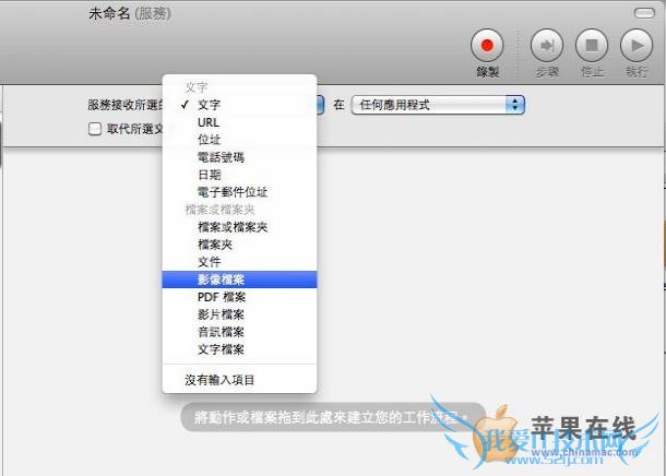 3. 将「服务接受所选的」选单指定为「影像文件」,并将「在任何应用程序」选择为「Finder」