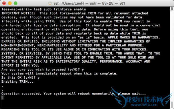 完成输入后,需要输入密码,然后输入 y(yes)并回车。系统会自动重启,重启完成后,TRIM 支持已经开启。