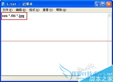 3、在同一文件夹下,新建一个txt的记事本文件,打开这个新建的txt文件,输入ren *.tbi *.jpg(注意:ren和tbi后面各有一个空格)。其中tbi是代表当前的要转换的文件后缀名,jpg是代表要转换成的文件后缀名 。
