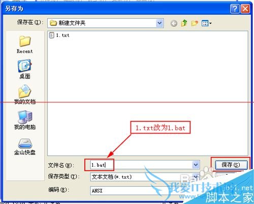 4、把该txt文件另存为后缀名是.bat的文件(即存为MS-DOS批处理文件),比如,1.txt,保1.bat。也可以保存记事本后,直接重命名为1.bat文件(需显示图片扩展名)。