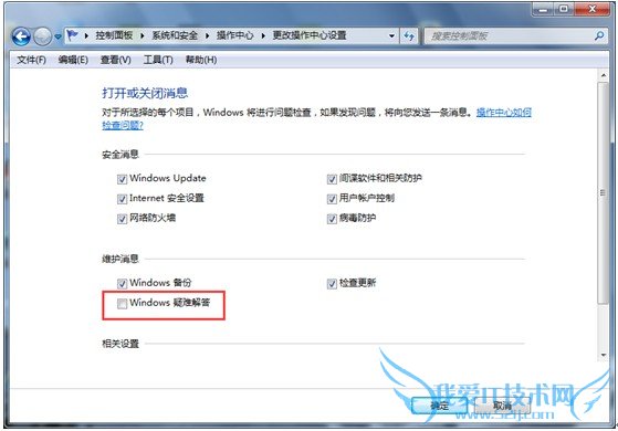 2:在打开的窗口中取消选中“维护消息”栏中的“windows 疑难解答”复选框,如图所示。