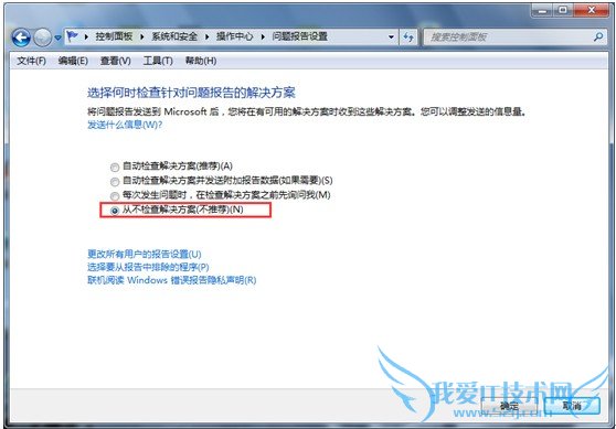3:单击窗口下方的“问题报告设置”超链接,在打开的窗口中选择“从不检查解决方案”单选按钮,如图所示。