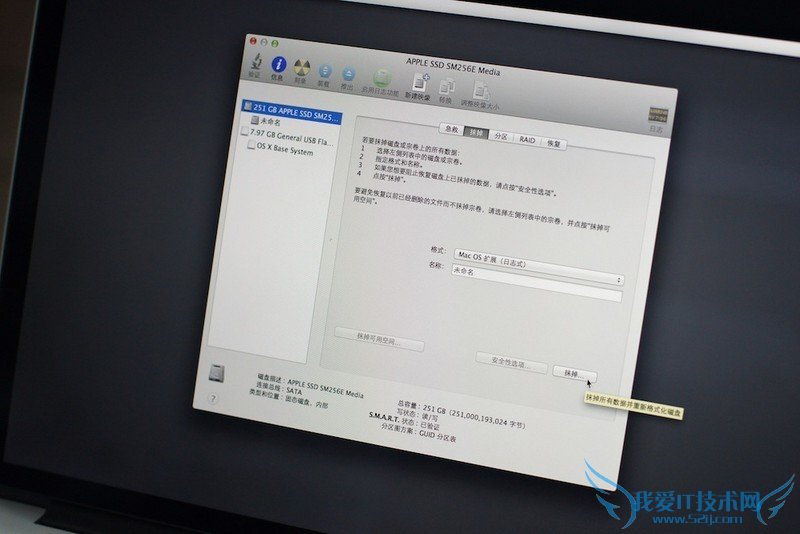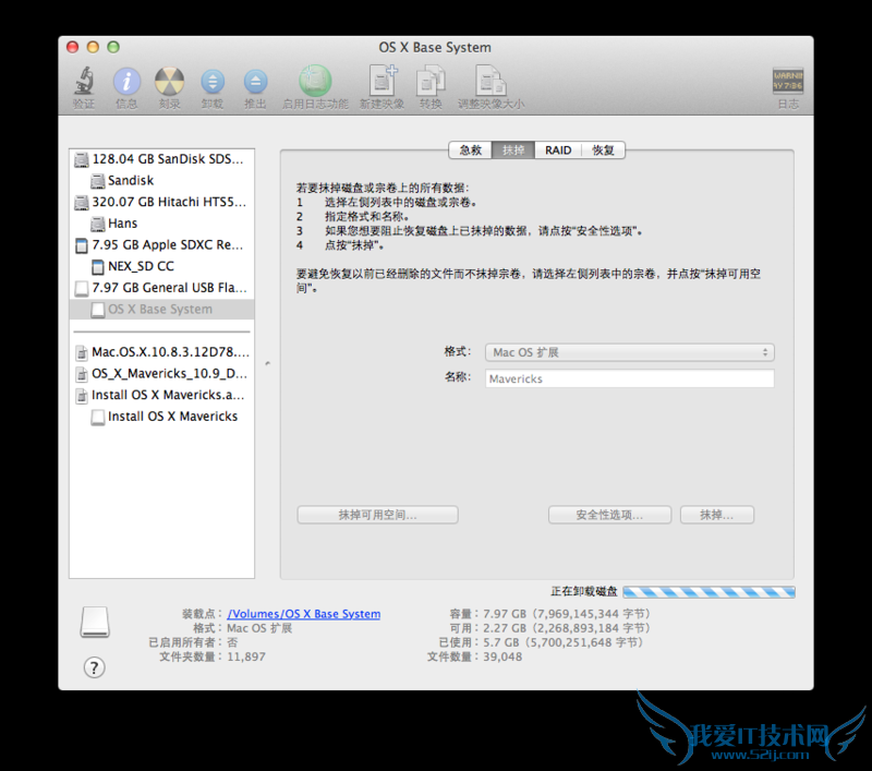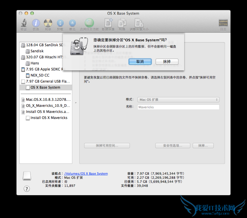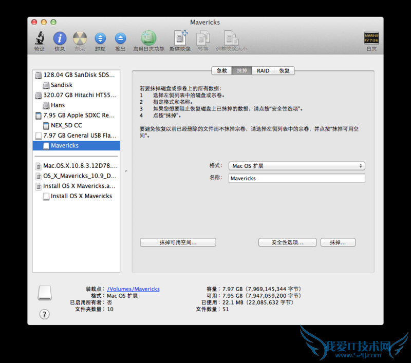格式为“Mac OS扩展”格式,名称输入“Mavericks”(一定记住是这个名字,后面的命令需要用到)