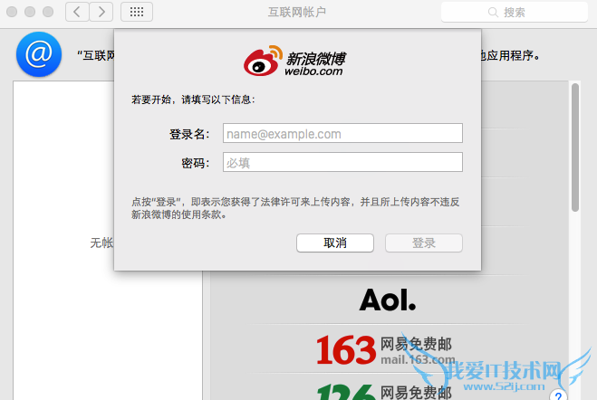 6、系统会自动跳出系统偏好设置中的互联网帐户设置,在这里填入自己的微博帐户即可。