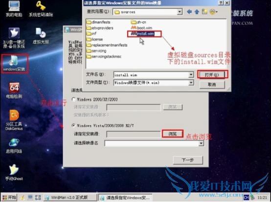 4.进入WINPE界面后,双击运行“windows安装”,单击“浏览”按钮找到虚拟磁盘下的sources目录下的install.wim