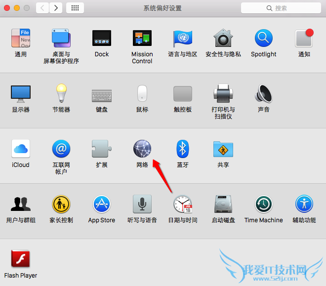 1)在弹出的系统偏好设置对话框选择“网络”。
