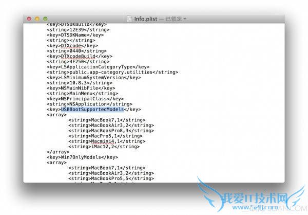 然后编辑桌面上的 Info.plist,可以用任意纯文本编辑器打开进行编辑,找到 PreUSBBootSupportedModels,将其修改成 USBBootSupportedModels,其实也就是将前面的 Pre 去掉,然后保存之。