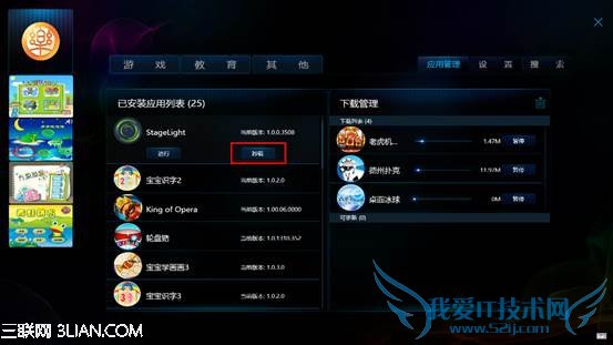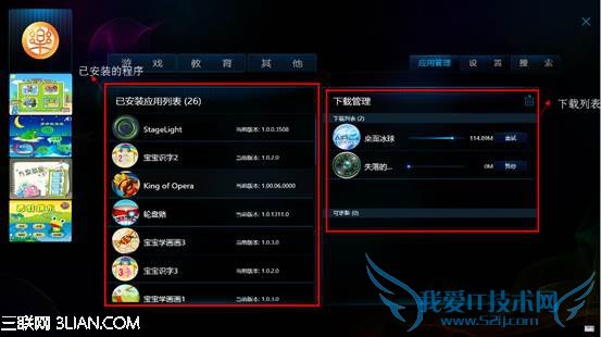 点击右侧的“应用管理”,打开后左侧是已安装的程序,右侧为正在下载程序的列表;