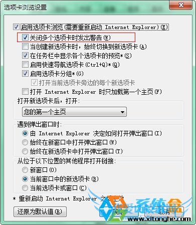 3、在打开选项卡设置窗口后,我们勾选其中的“关闭多个选项卡时发出警告”的选项,然后确定,如下图所示:
