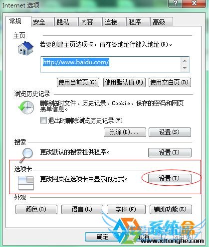 2、打开Internet选项后点击选项卡区域的“设置”按钮;