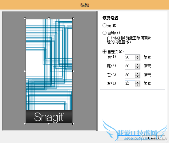 我们可通过截图软件设定自动切边处理。如Snagit软件中就有“效果→裁剪”设定,可选择自动检测并裁剪图像周边的纯色区域,也可以自定义要剪掉的四周尺寸(图6)。设定之后截取图片,抓取结果将是截掉边缘的图片。