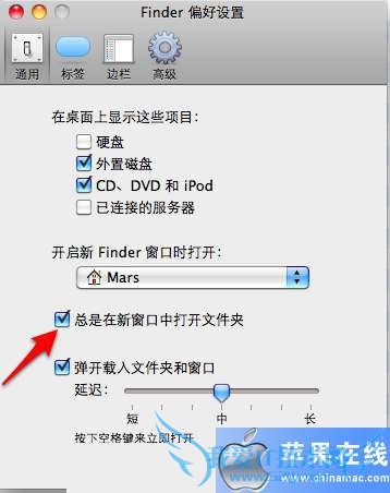 在苹果系统里,默认设定是双击一个文件夹后,它将在同一窗口内把此文件夹打开,我们将不能看到原窗口的内容,除非你点击后退按钮。