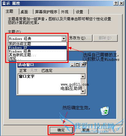 2、在打开的“显示属性”窗口中的主题选项卡中,主题下面的下拉菜单中选“Windows XP” 然后确定即可。