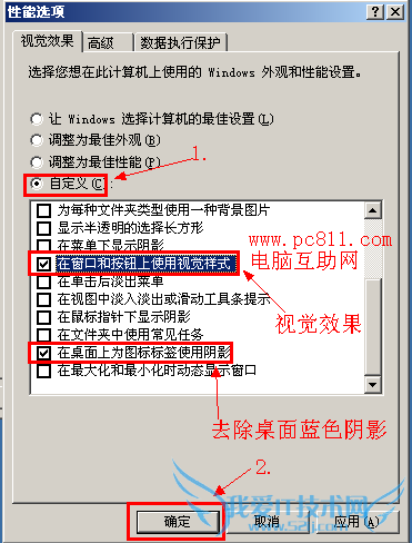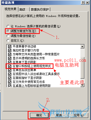 注:性能选项中主要是把“在窗口和按扭上使用视觉样式”此项选中即可。