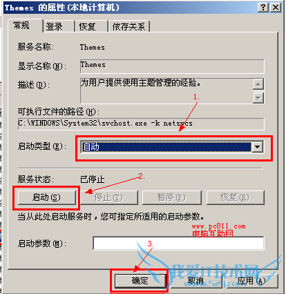 3、在打开的Themes的属性窗口中,启动类型设置成自动,并单击启动按扭,然后确定即可。