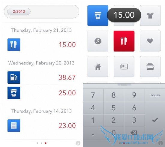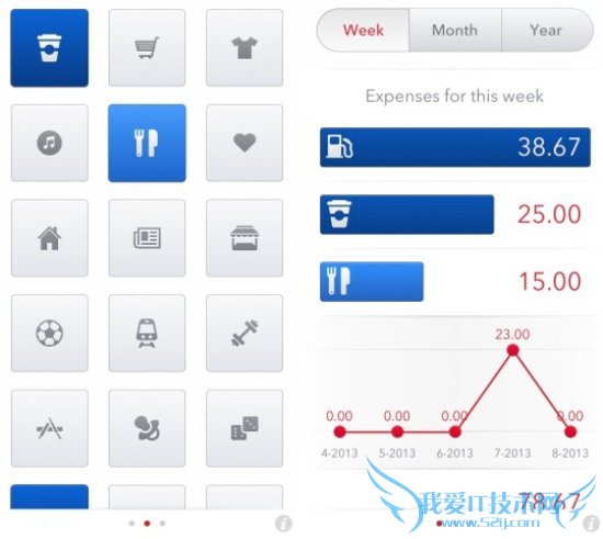 费用视图将会把使用者所有目前的开支以列表的形式展现出来,并且以日期为标准进行排列。同样点击某项图标之后可以看到该项费用的具体支出情况。如果针对某项物品开支进行滑动,那么就会出现删除按钮,这样就可以将偶尔的支出删除,避免该项支出影响整体支出追踪的准确性。同样本项支出的统计周期可以以周、月和年为单位。