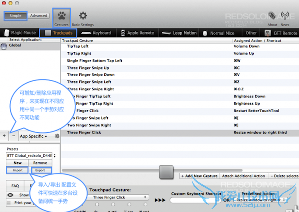 寻觅了很久适合imac的多功能无线鼠标,一无所获。不经意间看到介绍BetterTouchTool的文章,如获至宝。os x对触控板的设置并没有完全发挥出它的潜力,右手能干的事情还可以更多。BetterTouchTool(简称BTT)就是这样一款软件,把触控板的潜力发挥到淋漓尽致。平时使用方面(非游戏),功能上秒杀G700s,即便是20多个功能键的G600也望尘莫及。