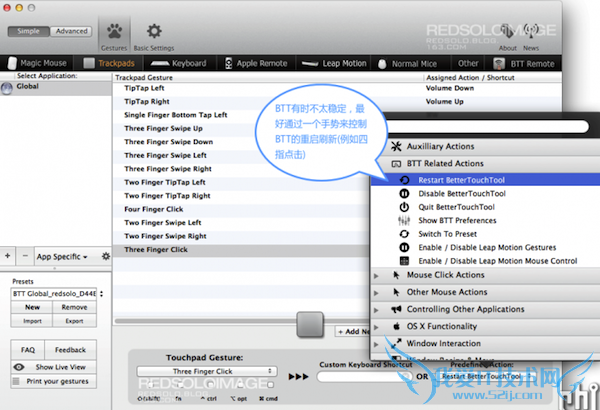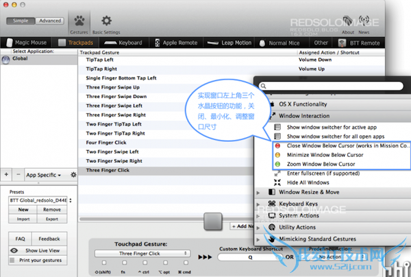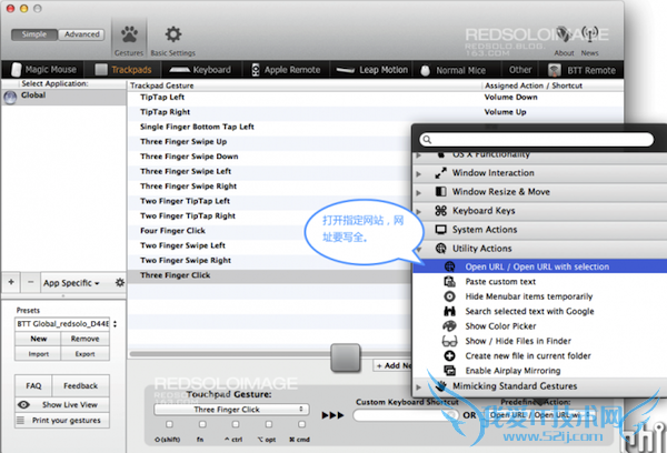 三、附加设置,BTT除了可以用手势代替普通快捷键,还可以实现打开软件控制音量等其他功能: