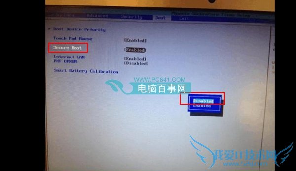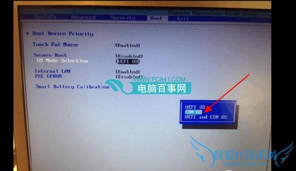 2,按ESC返回BIOS界面,用方向键知道BOOT选项,选择“Secure Boot ”标签,将“Enabled”修改为“Disabled”,此后,会在“Secure Boot”弹出一个叫“OS Mode Selection“的选项.将“UEFI OS”更改为“CSM OS”即可