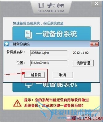 2.点击“一键备份”按钮,弹出确认框,如图:
