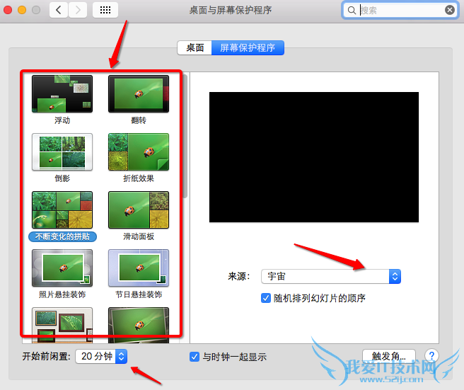 3、接下来我们设置屏幕保护程序,如图所示,左侧红色方框内的是Mac内置的屏幕保护程序效果,可以挑选自己喜欢的类型。左下方的“开始前闲置”就是设置Mac进入屏幕保护程序的时间。