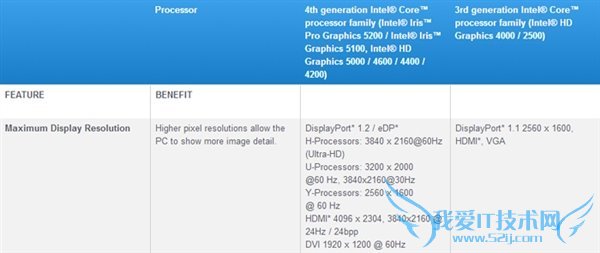 而且值得注意的是,移动版的U系列产品最高只能输出3840*2160@30Hz的分辨率规格,Y系列在60Hz刷新率下只能输出2560*1600分辨率,只有H系列也就是配置了Iris系列核心显卡的产品才能输出3840*2160@60Hz的分辨率规格。至于上一代Ivy Bridge则最高只能输出2560*1600,全部不支持输出4K分辨率。