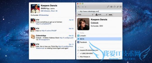 这只是刚开始而已,它能做的可不止这么一点。将它与你的 Facebook、LinkedIn 或 Twitter 账号关联,它就能导入社交网络里的联系人。如果发现与现有联系人相关的数据,将会被自动添加到已有联系人中。例如,如果向某个已有的联系人中添加一个 Twitter 账号,那么 Cobook 会自动将该账号简介中的链接添加到此联系人中。这实在是太方便了。