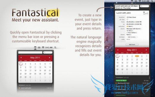 Fantastical拥有色彩鲜艳的优美界面设计风格,绝对是你在Mac上见过的最有吸引力、使用最方便的日历了。它帮助你快速安排行程,你甚至可以改变事件的先后顺序,为不同事件设置颜色分类,自行决定显示哪个对你来说重要的。另外,它还可以和iCal日历以及iOS reminders无缝同步。