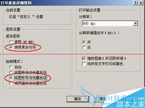 5、将“使用更多内存”和“将图形作为光栅发送”选中,确定打印。
