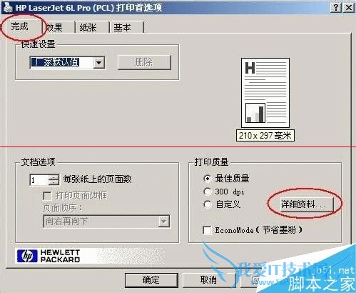4、在弹出的“打印首选项”设置窗口中,进入“完成”选项卡,点取“详细资料”;