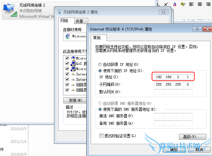 我把无线连接的地址设置为192.168.2.1,手机上设置为跟它同网段的192.168.2.20.