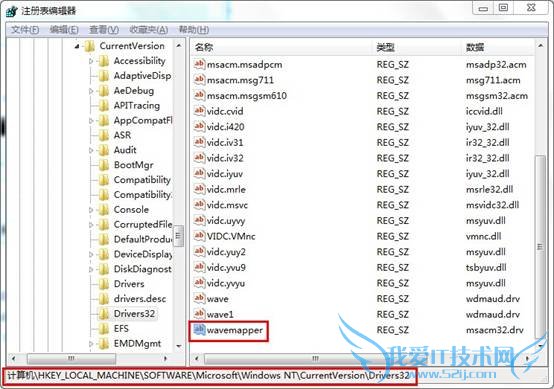 2.在打开的注册表编辑器里找到HKEY_LOCAL_MACHINESOFTWAREMicrosoftWindows NTCurrentVersionDrivers32查看右边的窗口有没有“wavemapper”值。如下图所示