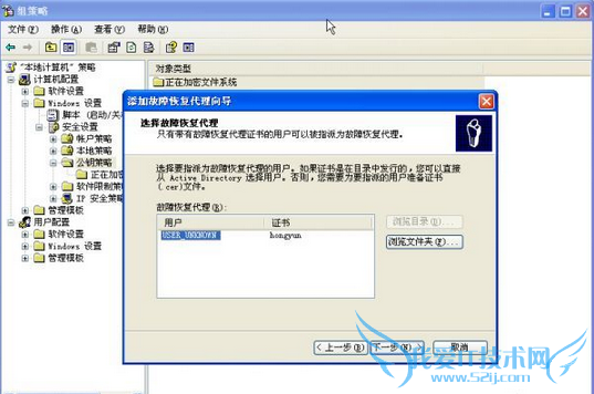 这样,就在C盘根目录下生成两个文件,扩展名分别为“cer”和“pfx”。本例中生成的文件为“mykey.cer”和“mykey.pfk”,其中“mykey.cer”为公钥证书文件,“mykey.pfk”为代理人的私钥证书文件。在“开始”→“运行”中运行“gpedit.msc”命令,打开组策略编辑器窗口。在窗口左侧的列表中依次展开“计算机配置”→“Windows设置”→“安全设置”→“公钥策略”→“正在加密文件系统”分支,在其右键菜单上点击“添加数恢复代理程序”项,弹出操作向导界面(如图2)。在其中的“选择故障恢复代理”窗口中点击“浏览文件夹”按钮,在文件选择窗口中导入前面创建的“mykey.cer”文件,之后依次点击“下一步”按钮完成操作。