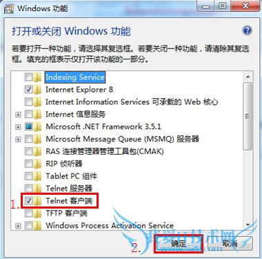 3、在“打开或关闭Windows功能”中,找到需要的添加组件如上图中“Telnet客户端”,选择前面对勾,点击“确定”即可。