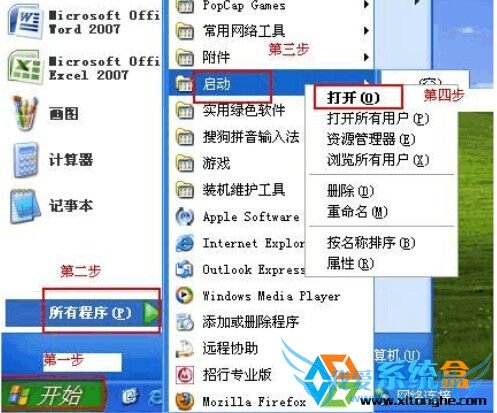 2、做完第一步以后,我们打开"开始菜单"——“所有程序”——“启动”,右键点启动——打开,这时XP系统会打开启动项目的文件夹,这时我们把宽带连接的快捷方式复制或拖动到启动文件夹内。