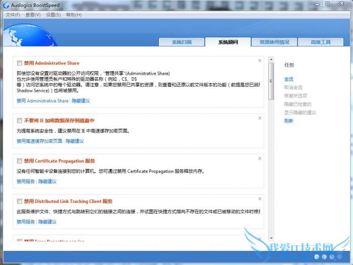 接下来是系统顾问模块,他会对本机所存在的影响电脑运行速度的问题进行合理化的建议
