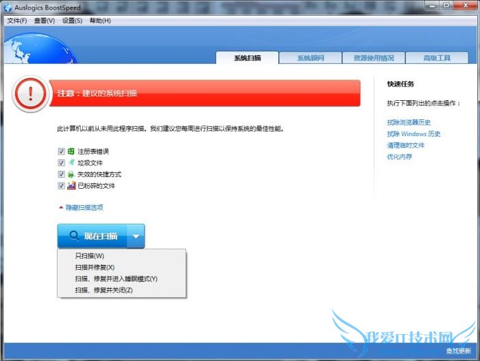 Auslogics BoostSpeed 的主界面提供了一键扫描的功能,默认勾选全部四项优化内容,包括“扫描注册表错误”,“垃圾文件”,“失效的快捷方式”用户可以根据自己的需要进行适当的增减。