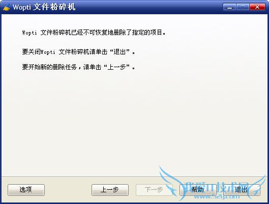 粉碎完毕,进入结束界面。在此界面,您可以单击“退出”按钮退出文件粉碎机,或单击“下一步”按钮,开始一次新的删除作业。