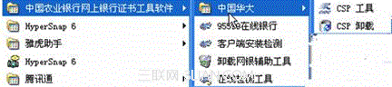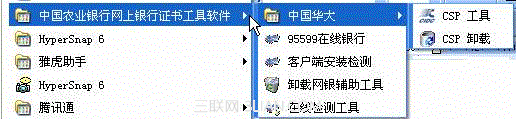 1)验证是否正确安装“证书工具软件”。点击“开始”---“程序”,---“中国农业银行网上银行证书工具软件”菜单。如不存在“中国华大”--- “CSP工具”的菜单,可判断为没有正确安装智能安装程序,此时请您安装后重新登录。如下图所示: