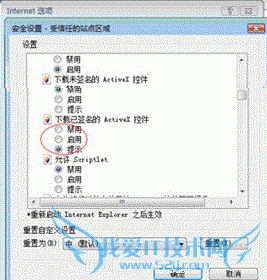 2)检查Activex控件的设置选择"IE---工具---Internet选项---安全---可信站点",点"自定义级别(C)"按钮,在弹出的界面检查如下两项设置(如下图所示):