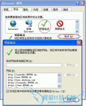 1)首先检查是否已加入信任站点,选"IE->工具->Internet选项->安全->可信站点",会弹出如下界面: