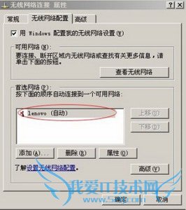 然后单击“确定”退出,在“无线网络配置属性”对话框下部的首选网络中会出现所设置的网络名称,如下图所示: