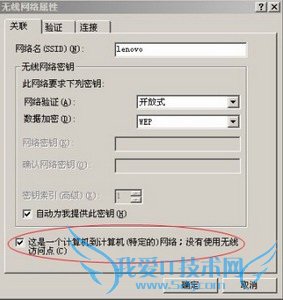 7、设置服务设置标识(SSID):在打开的“无线网络属性”对话框中输入一个服务设置标识(SSID),例如“lenovo”,SSID必须和您想要连接的计算机或无线AP设置的SSID保持一致。如果您访问的是其它计算机,没有使用无线AP,将“这是一个计算机到计算机(特定的)网络;没有使用无线访问点”前打勾,如下图所示: