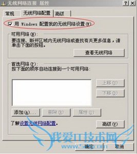 4、启用Windows无线管理:在无线网络连接属性对话框中单击“无线网络配置标签”,在“用Windows来配置我的无线网络配置”前的复选框打勾,以启用Windows XP自带的无线网络管理。如下图所示: