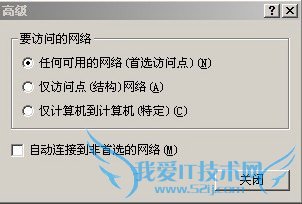 5、选定网络类型:单击对话框右下角的“高级”按钮,打开无线网络的高级选项,如下图所示,选择“任何可用的网络(首选访问点)”,也可以根据实际的连接方式选择其它方式,单击“关闭”退出。